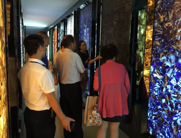 步入五号仓库,一块块大板犹如一幅幅艺术珍品一般整齐的排列在两侧,静静地等着人们前来观赏。参观中,考察团一行被天然石材所呈现的独特纹理、形态、色泽所深深吸引,不住地点头赞叹,而五号仓库所呈现的石材创意也得到了考察团的充分肯定。