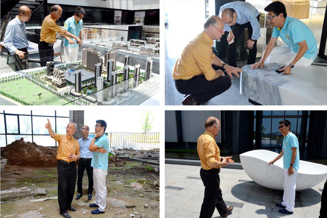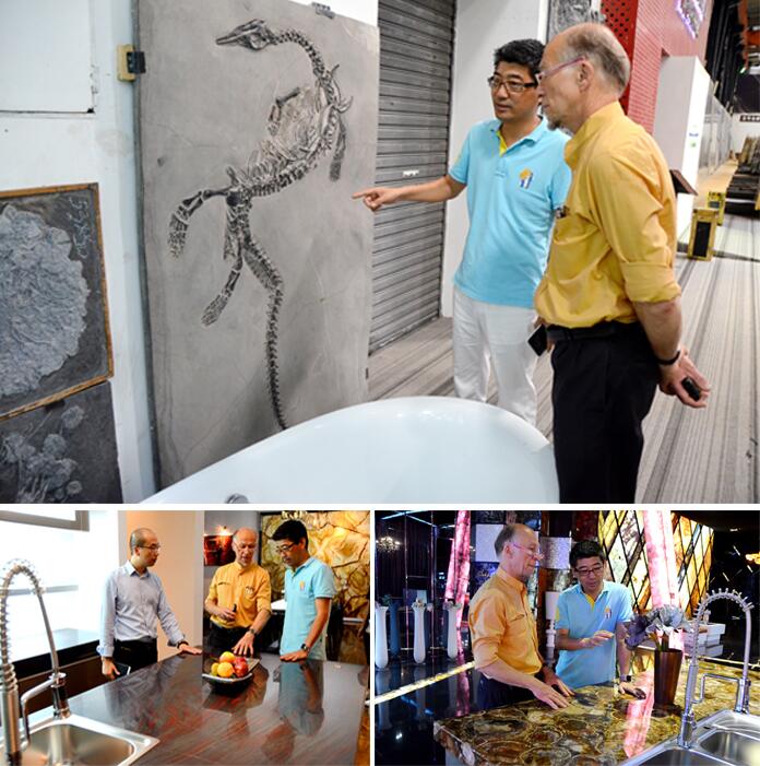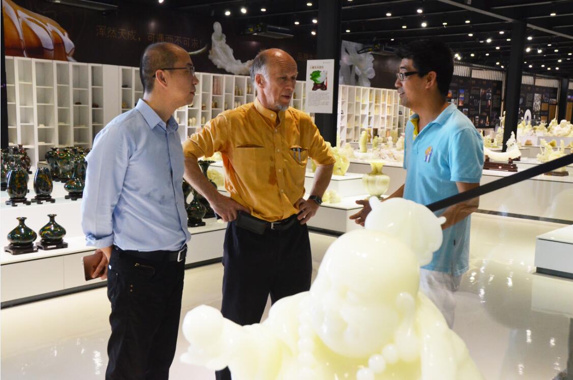 在五号仓库新馆内,英良集团董事长刘良向尼古拉大师详细介绍了工艺品馆、石材图书馆、石材体验馆、下沉式商谈空间、石材应用展示盒子、世界级的高端石材选材中心。