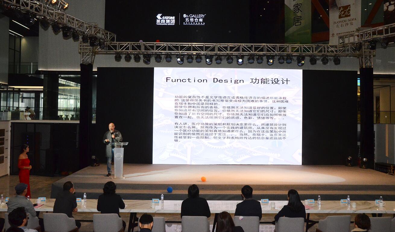 在参观了五号仓库体验馆后,众设计大咖对五号仓库赞不绝口,他们与英良集团董事长刘良先生、英良集团总裁齐飞就石材的设计创新、石材该如何用、如何用好石材、如何更好地对石材进行设计等方面做了深入的交流与讨论。